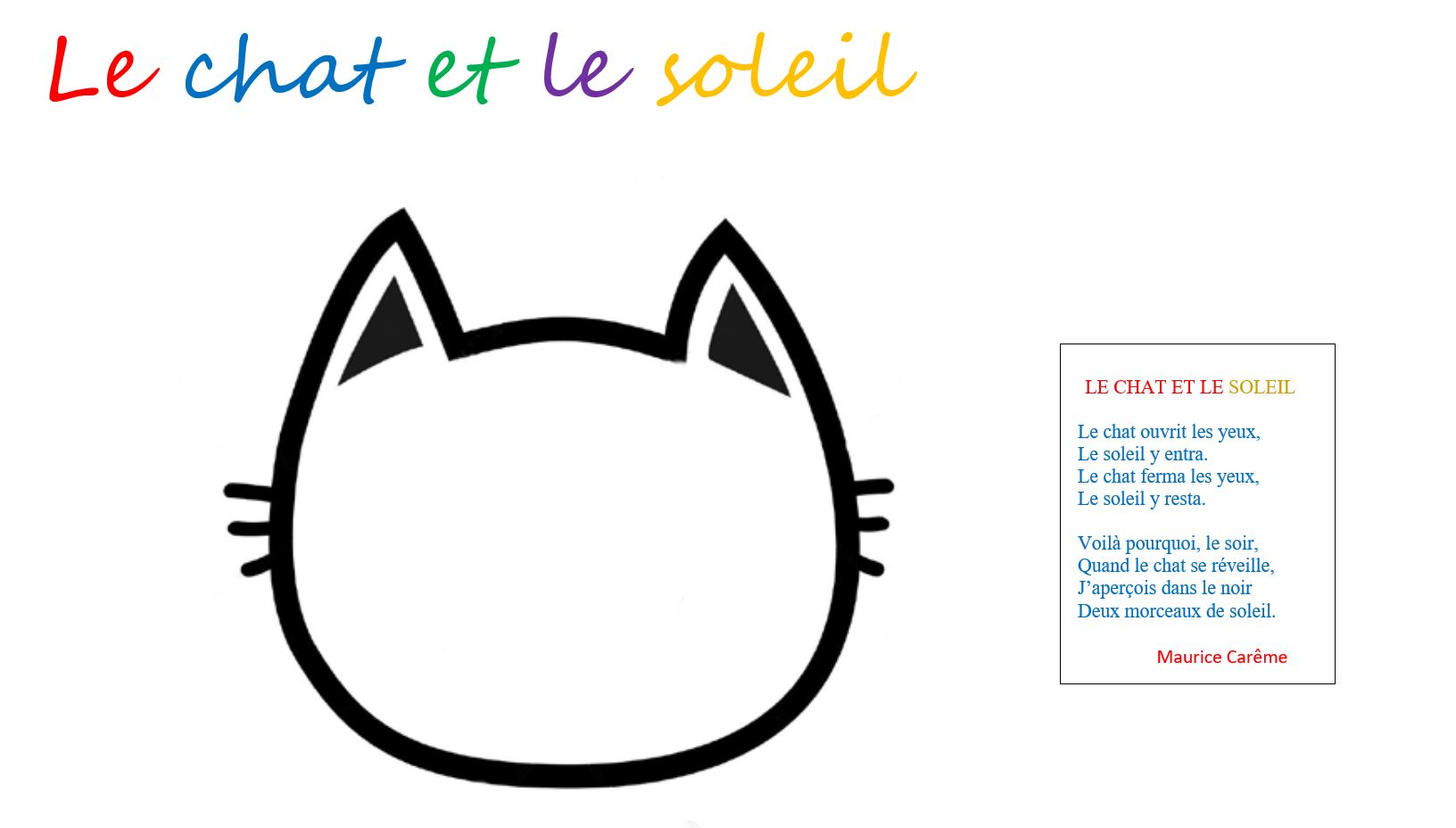 Le chat ouvrit les yeux, Le soleil y entra Le chat ferma les yeux, Le soleil y resta Voilà pourquoi, le soir, Quand le chat se réveille, J'aperçois dans le noir Deux morceaux de soleil Maurice Carême J'ai choisi ce poème dans un premier temps pour son thème, leLe chat ouvrit les yeux, Le soleil y entra Le chat ferma les yeux, Le soleil y resta Voilà pourquoi, le soir, Quand le chat se réveille, J'aperçois dans le noir Deux morceaux de soleil MauriceLe chat ouvrit les yeux, Le soleil y entra Le chat ferma les yeux, Le soleil y resta Voilà pourquoi, le soir Quand le chat se réveille, J'aperçois dans le noir Deux morceaux de soleil Maurice CARÊME LLEE CCHHAATT EETT LLEE SSOOLLEEIILL Le chat ouvrit les yeux, Le soleil y entra Le chat ferma les yeux, Le soleil y resta